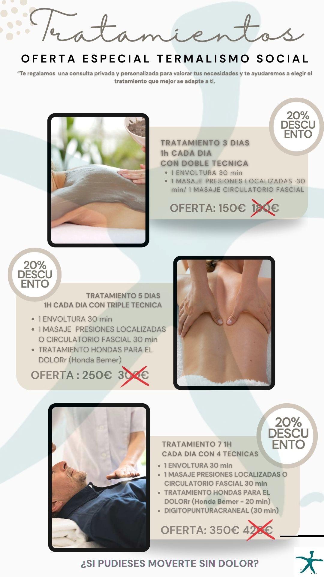 ![]() | RELAJANTE / SERENIDAD | Eso que te pesa en los hombros… no es solo cansancio. Es la mochila invisible que arrastras desde hace tiempo…tumbarte, cerrar los ojos…y dejar que alguien, por fin, se ocupe de ti. Te daras cuenta de que llevabas semanas sin parar. Masaje relajante en el balneario. 60 minutos de puro oro. Te lo mereces. Reserva ya. Aprovecha que vienes para soltar con lo que cargas. Tú eliges. | ||